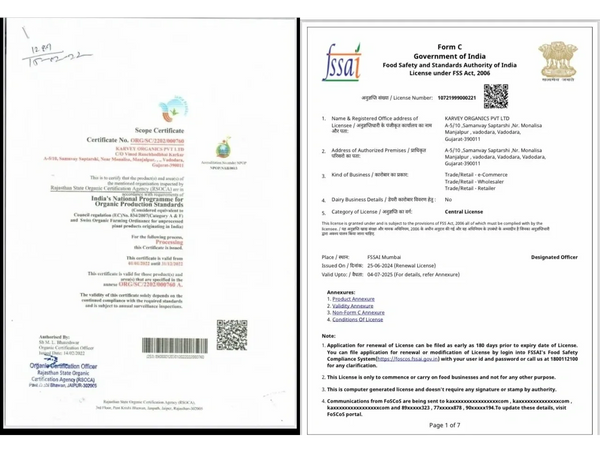 Karvey Organics Pvt Ltd successfully registered and obtained both an FSSAI license and an organic certification. It ensures that our products meet the necessary food safety and organic standards set by the Food Safety and Standards Authority of India (FSSAI) and the National Programme for Organic Production (NPOP).